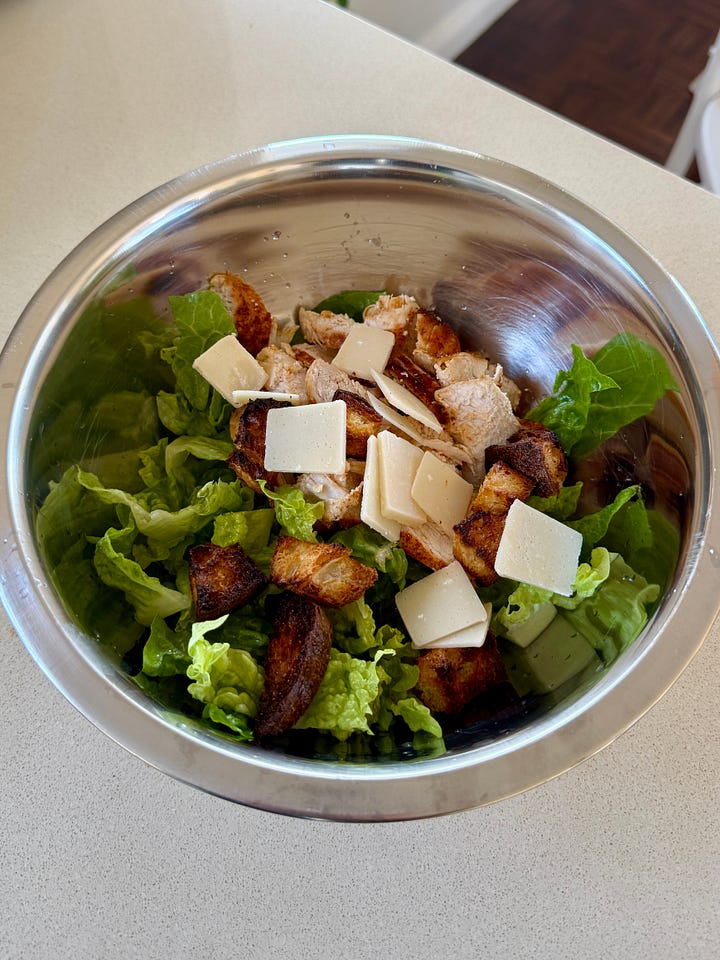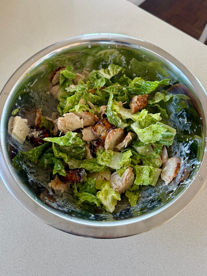 In a bowl, toss the chopped lettuce, chicken, parmesan and croutons with your homemade dressing until everything is well coated.
