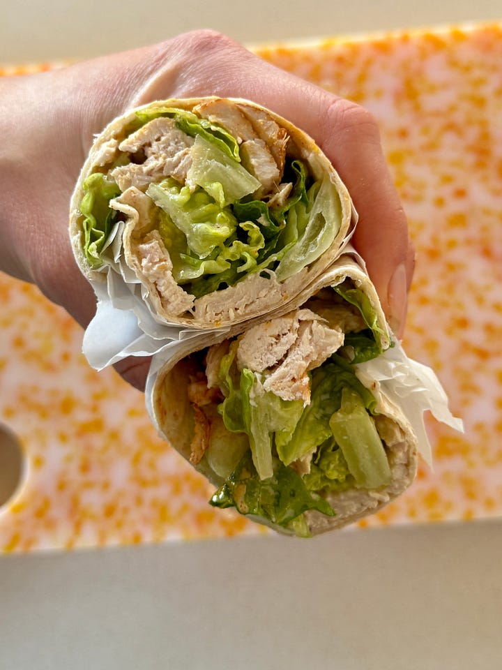 Note: If you want to prep this wrap further in advance, simply double the recipe and keep the dressing separate, then toss the salad with it just before eating. This helps keep the lettuce crisp and the wrap fresh for longer.